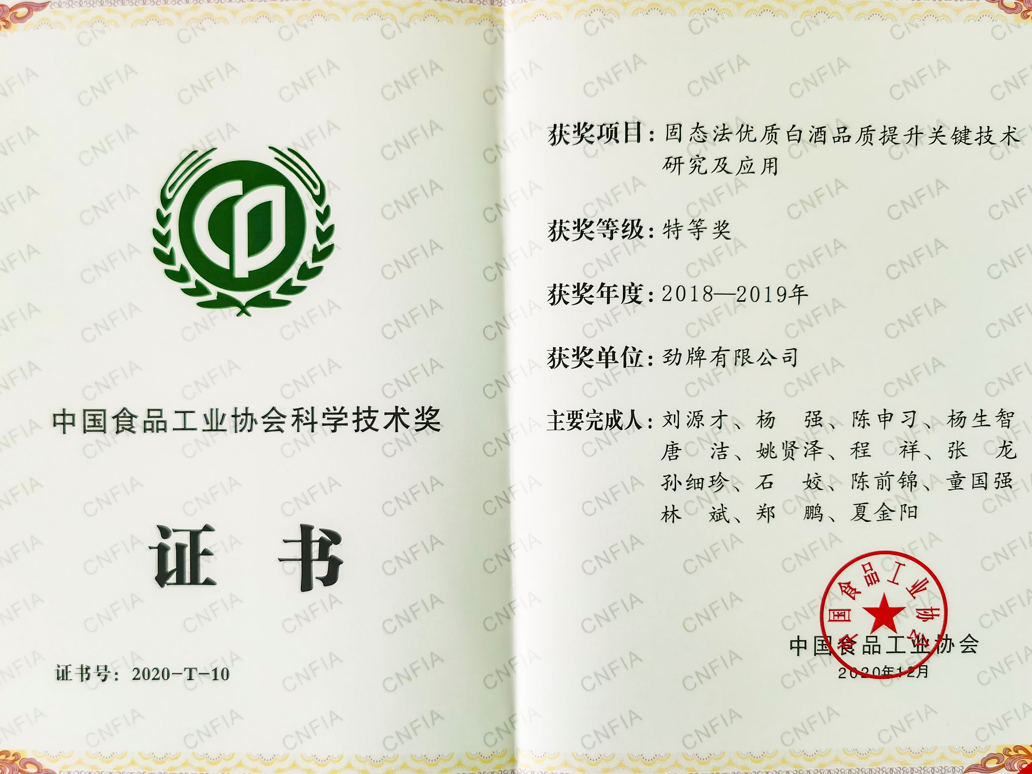 12月6日,2020第四届中国食品产业发展年会暨华糖万商大会全会在河南郑州开幕。大会颁发了2020年度“中国食品工业协会科学技术奖”,劲牌公司《固态法优质白酒品质提升关键技术研究及应用》项目荣获特等奖。